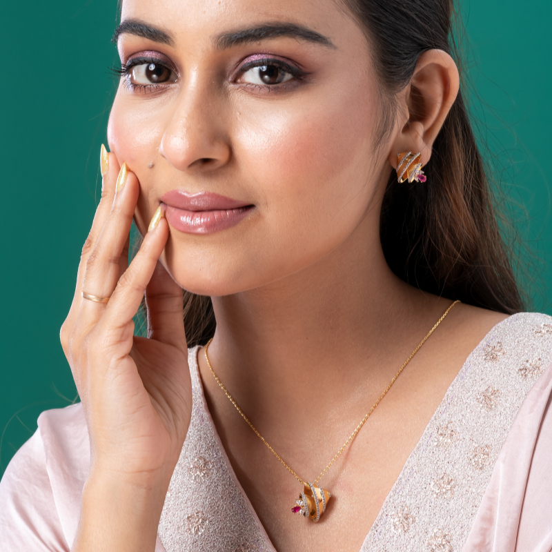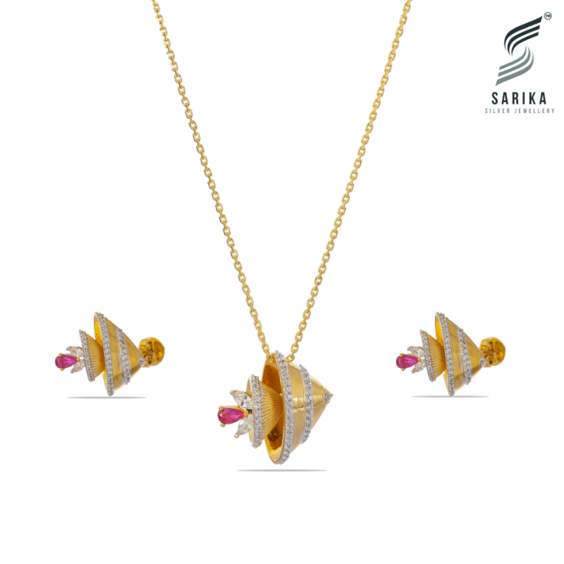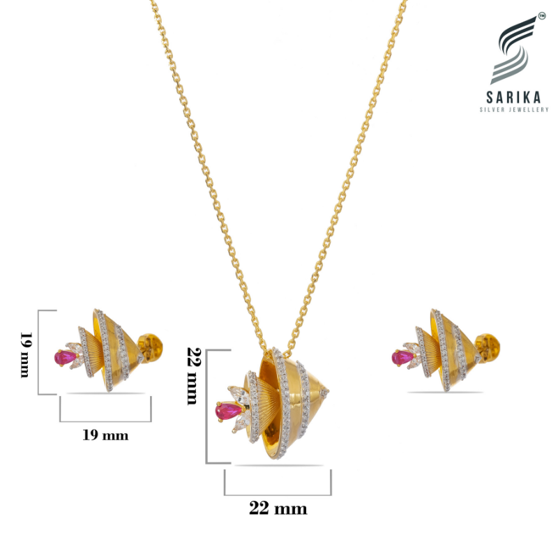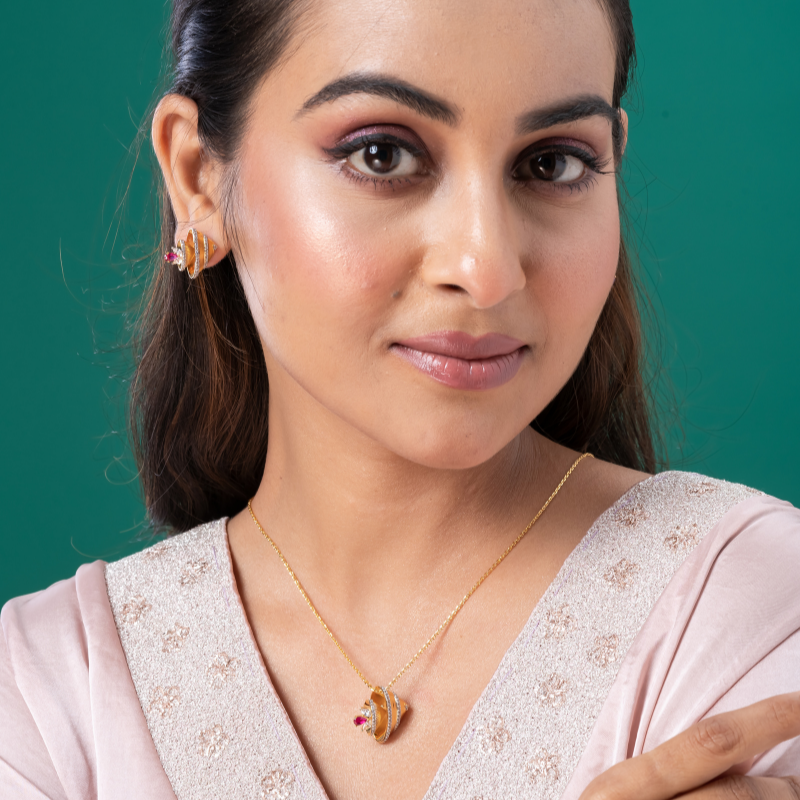 Crafted in 925 sterling silver, this set features a stunning pendant and matching earrings with a dual-tone high-polish gold and rhodium finish. The graceful curves cradle brilliant white cubic zirconia stones, creating a radiant interplay of sparkle and shine. With its perfectly balanced proportions, this set exudes a majestic aura ideal for both festive occasions and elegant evenings.