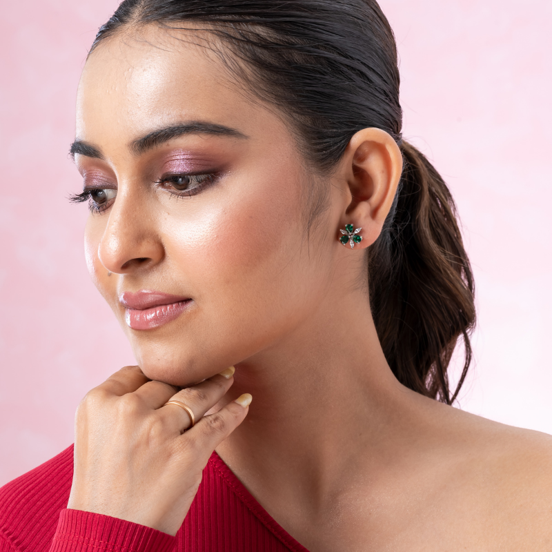 Inspired by the serene charm of emerald foliage kissed by morning dew, the Green Glimmer Studs bring a refreshing elegance to your everyday style. These earrings are a tribute to nature’s understated sparkle and balance.