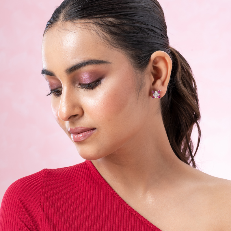 The Pink Radiance Studs are crafted from 925 sterling silver, featuring a graceful floral formation. Four vibrant marquise-cut pink stones form the petals, surrounding a cluster of brilliant white zircons in heart and pear shapes. Each stone is prong-set to reflect maximum light, giving the earrings a luminous and radiant appeal.