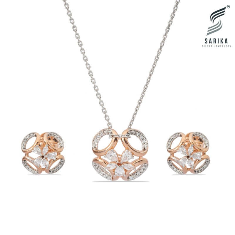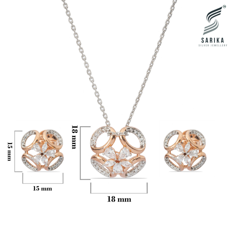 This set includes a pendant (18 mm x 18 mm) and matching earrings (15 mm x 15 mm), crafted in 925 sterling silver with a dual-tone high-polish gold and rhodium finish. The open-circle design frames a central floral arrangement made with pear-cut and marquise-cut cubic zirconia, creating a brilliant play of light.